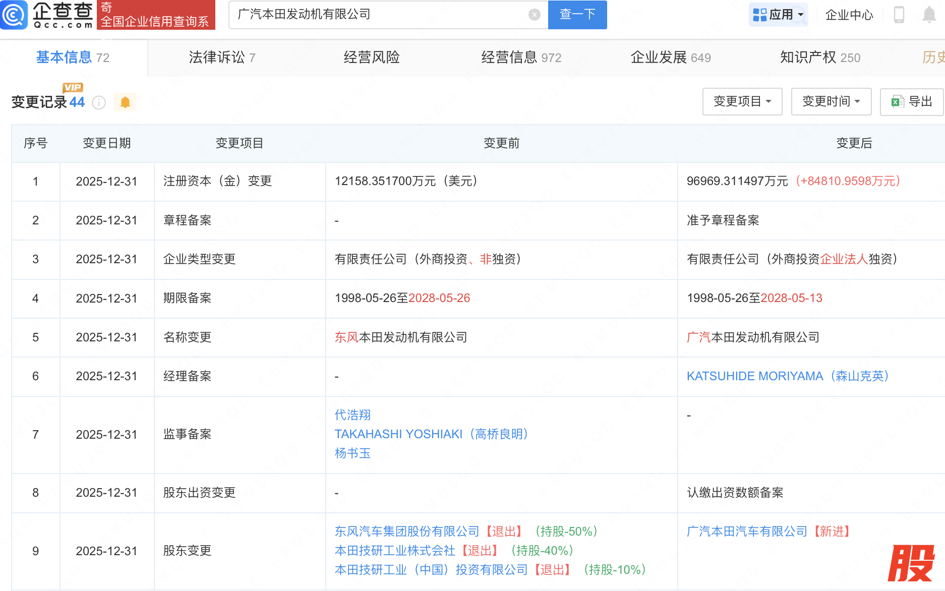 近日,原东风本田发动机有限公司发生工商变更,东风集团股份(00489.HK)等退出股东行列,新增广汽本田汽车有限公司为全资股东,同时企业名称变更为广汽本田发动机有限公司。企查查信息显示,该公司成立于1998年,经营范围包含:汽车零部件研发、汽车零配件批发、汽车零配件零售等。此前,广汽集团(601238)发布公告称,同意广汽本田收购东风集团股份持有的东本发动机50%股权。广汽本田完成股份收购后,东风集团股份将完全退出东本发动机公司,在完成交易后,东本发动机将成为广汽本田全资子公司,持有东本发动机100%的股份。